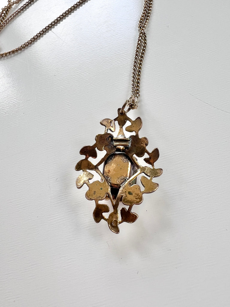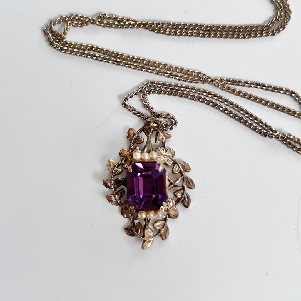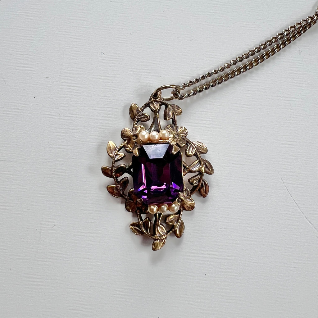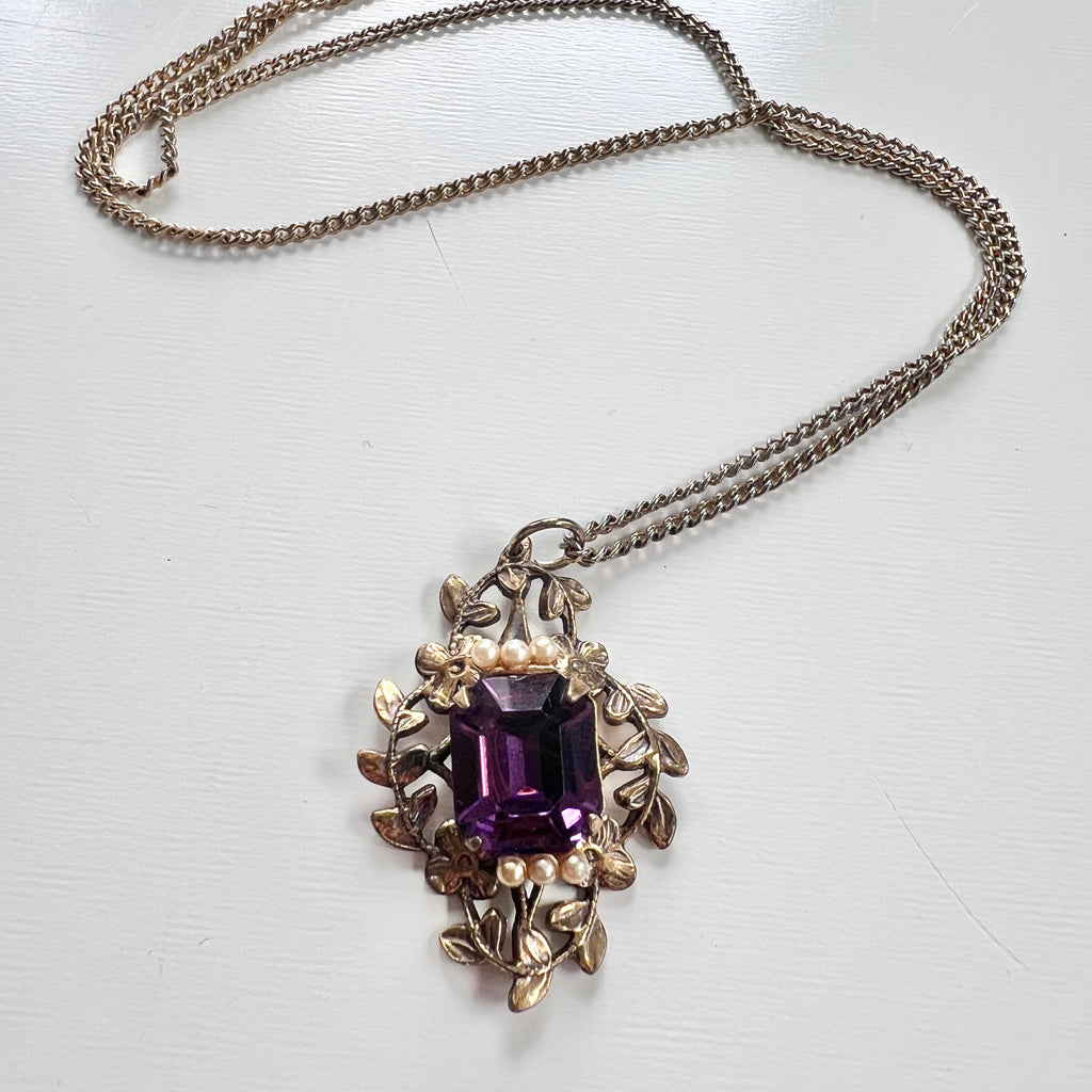 This beautiful costume piece is unmarked and features darling seed pearls and leaves surrounding a lovely amethyst stone. Unmarked chain measures approx 23”