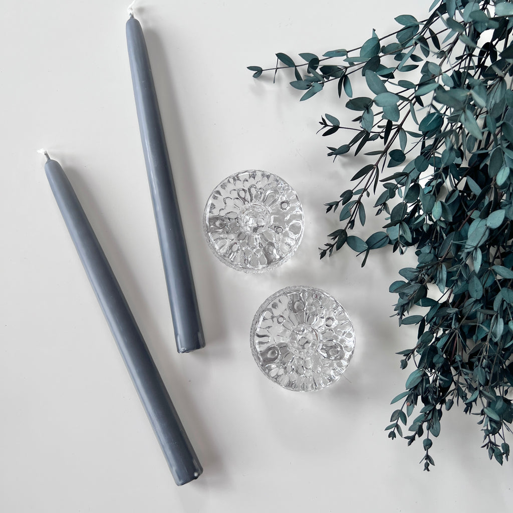 Beautiful set of 2 art glass candle holders with beautiful bubble design. 3 feet on each raise these slightly off the table.