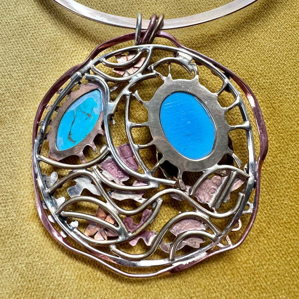 This is a true work of art! This large pendant with turquoise features brass, copper and silver with flowers and hummingbirds. A ring of each metal acts as the loop for it to sit on an open collar necklace. Scarabs are known as symbols of rebirth, resurrection, transformation, and growth and were said to be worn for good luck and protection. This piece has no visible markings.