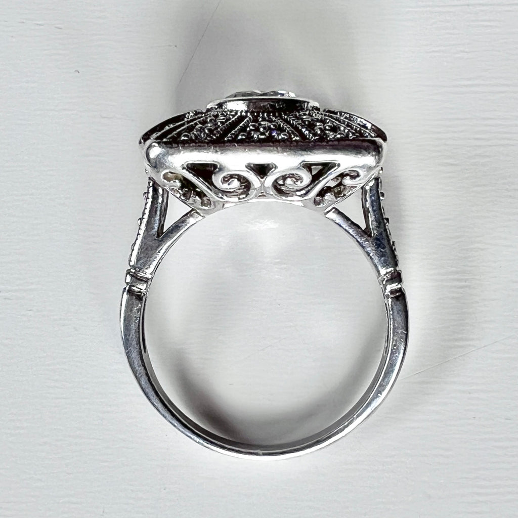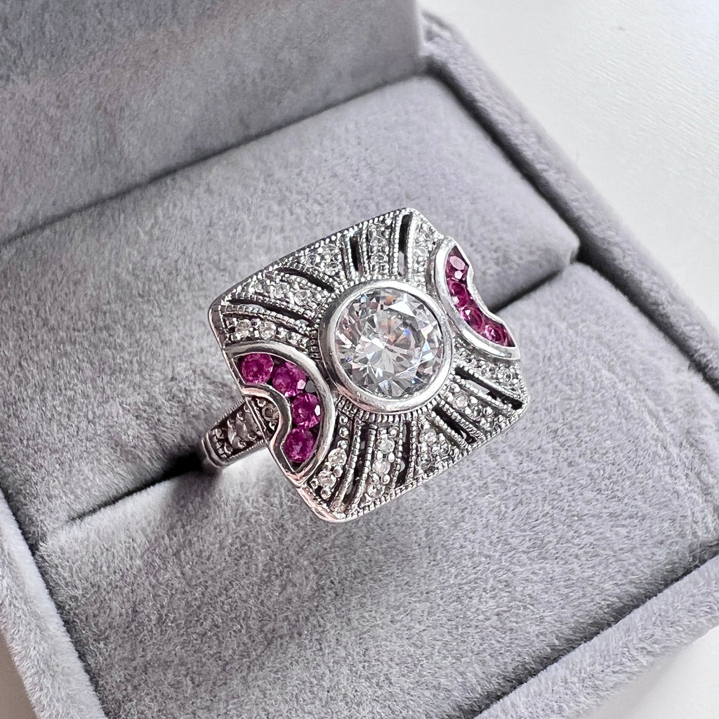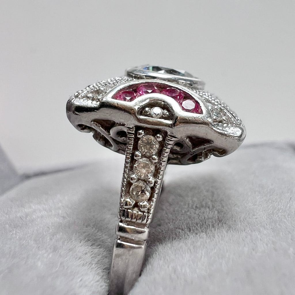 Stunning deco cut ring in sterling silver with clear and ruby coloured stones. Size 8 1/4